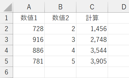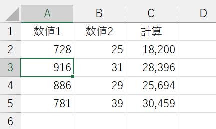A列とB列には適当な数値が入っています。C列には数式が入力されています。この中で「セル範囲B2:B5だけは編集できるけど、他のセルは編集できない」状態を作ってみます。このときの手順というか考え方なんですけど、ちょっと分かりにくいので説明します。