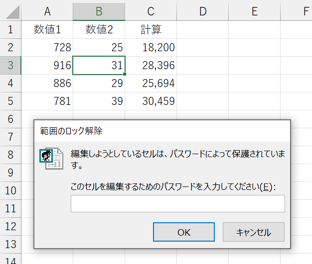 先の「セルのロックを外す+シートの保護」と同じです。では次に、パスワードを設定したセルを編集してみましょう。