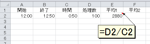 上図をご覧ください。ある処理の開始時間と終了時間を、それぞれセルA2とセルB2に記録しています。所要時間はセルC2です。「=B2-A2」という単純な計算式を入れています。そして、この時間で処理できたのが100回。セルD2が処理回数です。ここから、次の計算をしてみましょう。