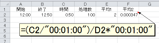 所要時間(セルC2)を1分("00:01:00")で割ると「50」という数値(1分が50個あるという意味)になります。それを処理回数の100で割れば「処理1回あたり0.5分かかった」ことが分かります。