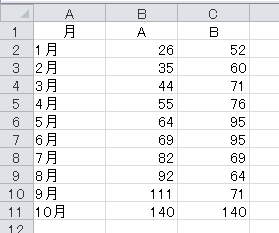 この手の表は、新しいデータが追記されるものです。で、10月のデータが追記されたら、グラフも更新しなければなりません。これを、自動的に更新されるようにしようというのが、今回のテーマです。もちろん、マクロを使わずに。
