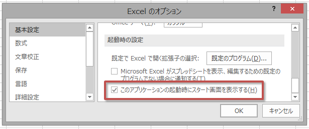 Excelのオプション「このアプリケーションの起動時にスタート画面を表示する」がオンになっていると