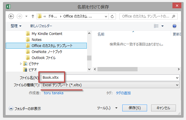 このとき「ファイルの種類」で「Excelテンプレート(*.xltx)」を選択します。選択すると、既定の保存先として「C:\User\<ログイン名>\Documents\Office のカスタム テンプレート」フォルダが表示されます。もし、別のフォルダに保存する場合は、保存したフォルダのパスを覚えておいてください。後で使います。ここでは「C:\User\<ログイン名>\Documents\Office のカスタム テンプレート」フォルダに保存したものとします。それからもうひとつ。保存する「ファイル名」は「Book.xltx」としてください。「Book1」じゃありませんよ、「Book」です。この名前のテンプレートを作ることで、Excel上で新規ブックを挿入したとき、このテンプレートから作成されるようになります。