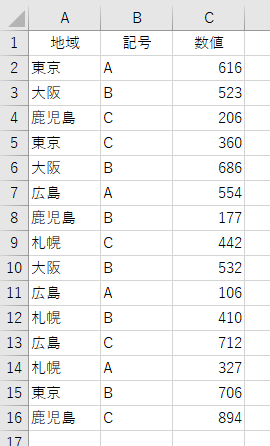 ここでは、次のような表をA列で並べ替えます。B列とC列は関係ありません。表が1列だけだと寂しいのでオマケです。