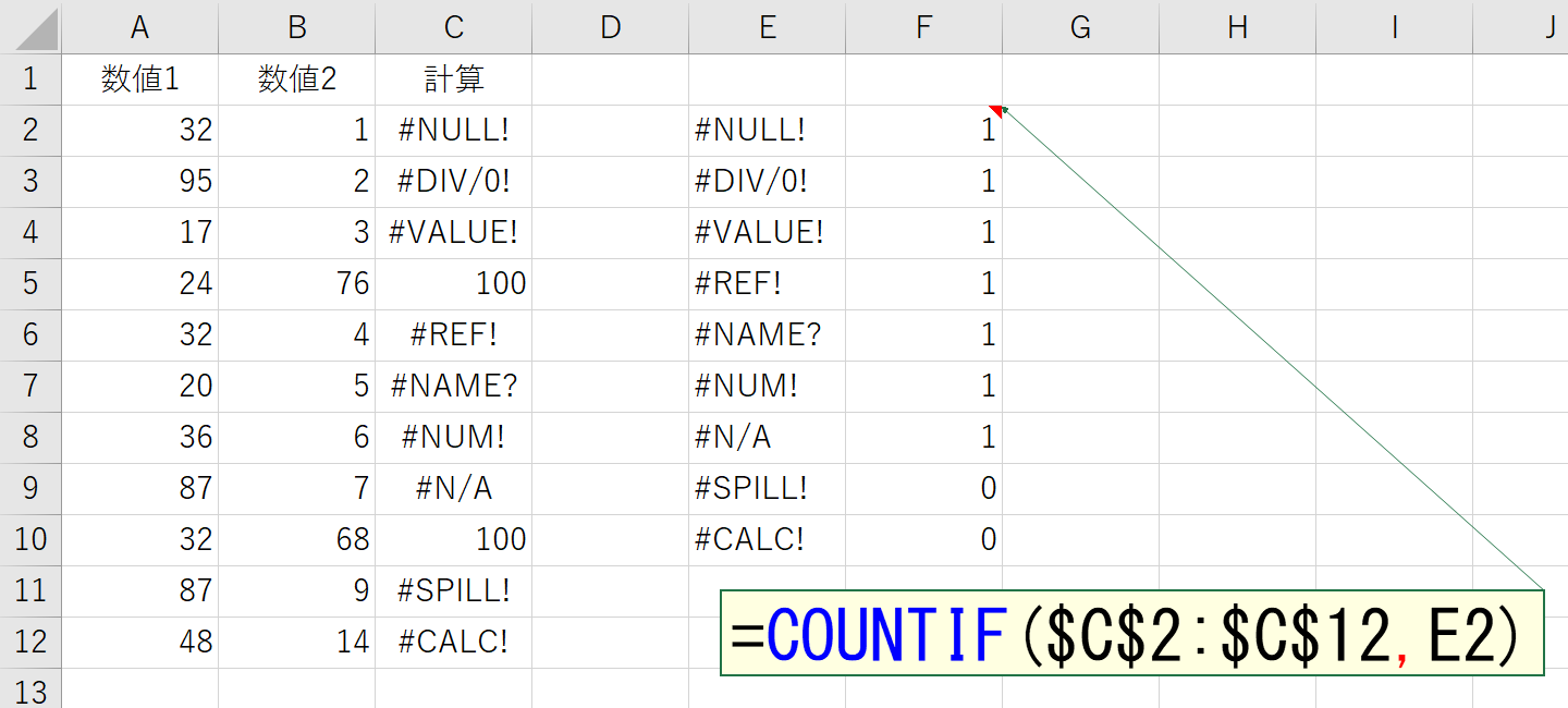 あれ?上図をよく見てください。最後の2つ「#SPILL!」と「#CALC!」がカウントされていません。