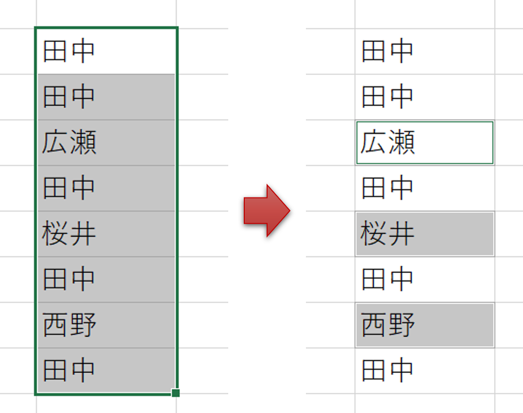 では、実際の動作をご覧ください。まず、条件付き書式が設定されているであろうセル範囲を選択します。