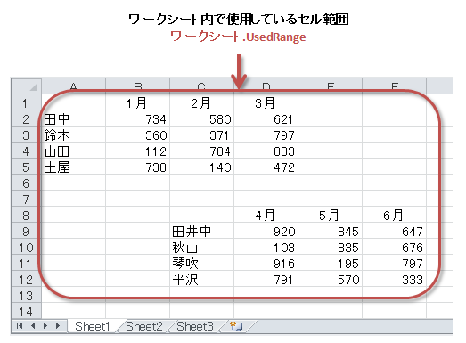 UsedRangeは、任意のワークシートで使用されているセル範囲を返します。使用されているセル範囲とは、セルA1から"最後のセル"までです。何も入力されていないワークシートでは、セルA1を返します。UsedRangeは、ワークシートが持つ命令です。使うときは