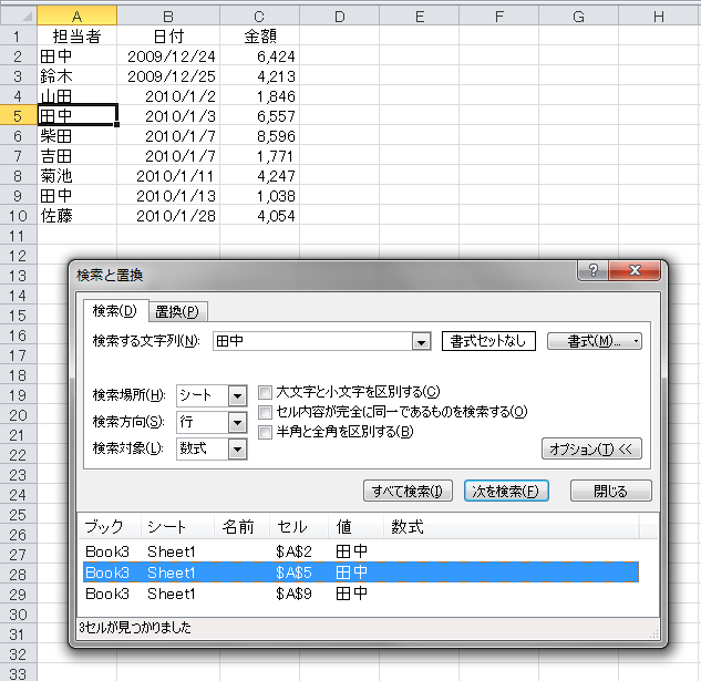 このとき、[すべて検索]ボタンをクリックすると、次のように、条件に一致したすべてのセルがリストアップされます。