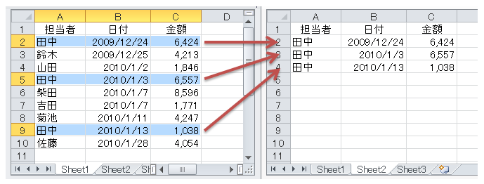 前ページの「見つかったすべてのセルを選択状態にする」では、見つかったセルを次々と変数Targetに格納しましたが、その代わりに、見つかったセルを次々と別のシートにコピーすればいいです。なお、ここでは、Sheet1のデータをSheet2にコピーするものとします。
