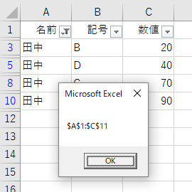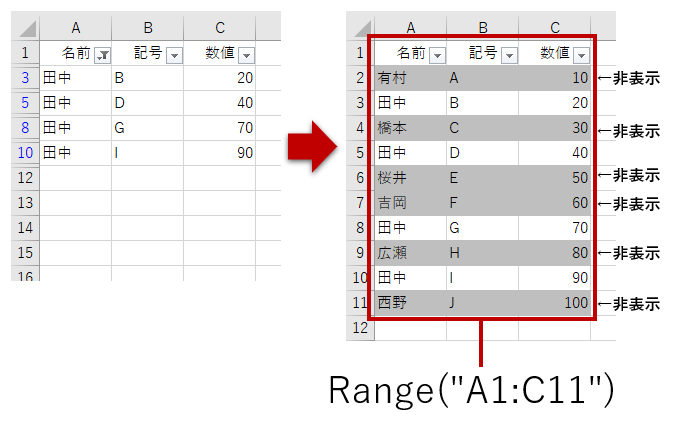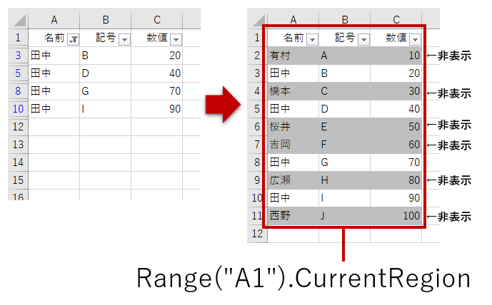 「A列が"田中"である」で絞り込んだ状態で、Range("A1").CurrentRegionは"ひとかたまりのセル範囲"を返します。これ実際には、次のように非表示セル(行)も含まれています。