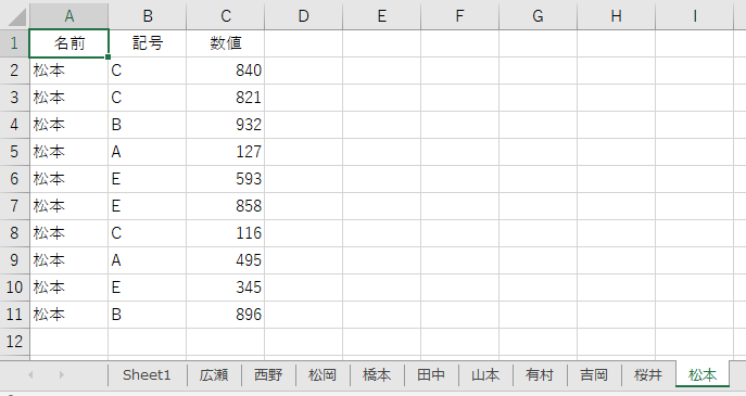 ここでは、上図のようなケースで解説します。A列にはたくさんの名前が入力されています。何人いるかは分かりません。このA列を、存在する名前で順番に絞り込み、その結果を新しいワークシートにコピーします。ついでに、新しいシートの名前も変更しましょうか。いずれにしても、このブックには元データが入力されている[Sheet1]しか存在しないとします。