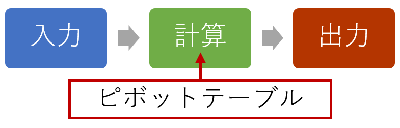 Excelは「入力」→「計算」→「出力」という流れで使うことで、最大のパフォーマンスを発揮します。言うまでもありません。これはExcelに限ったことではなく、そもそも業務というのは、この流れです。「入力」とは、いわゆる"元データ"です。「計算」は単なる足し算・引き算ではなく、編集・分類・抽出・加工などなど、元データに対して行う何らかの処理です。「出力」は"アウトプット"です。何らかの成果物を作ります。さて、この「入力」→「計算」→「出力」という流れの中で、ピボットテーブルは「計算」で使うものです。決して、ピボットテーブルが"最終成果物"ではありません。