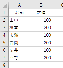 まずは、数値を「と等しい」で絞り込みます。「より大きい/小さい」とか「○から×の間」などの範囲で絞り込むのとは異なりますから、注意が必要です。ここでは、下図のような表を例にします。