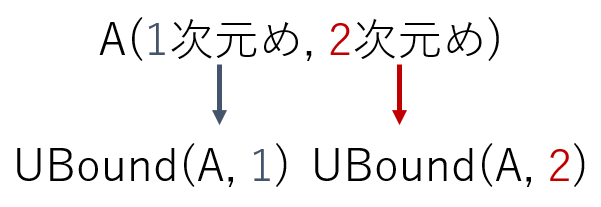 配列の大きさを調べるUBound関数は、一般的に1次元配列の大きさを調べることが多いので「UBound(A)」のように使いますが、実は大きさを調べる次元を指定することができます。