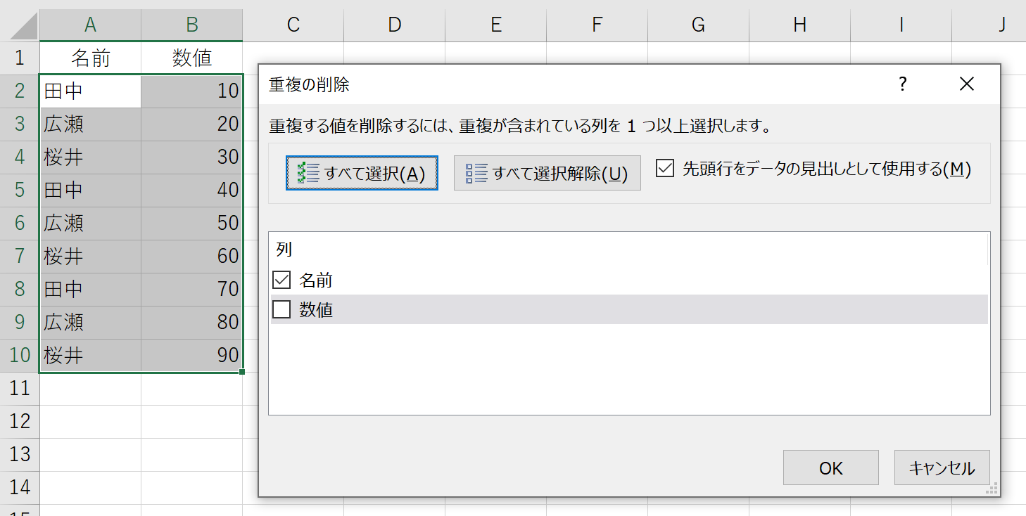 実行すると[重複の削除]ダイアログボックスが表示されます。[先頭行をデータの見出しとして利用する]チェックボックスをオンにして、「名前」列だけを選択してから[OK]ボタンをクリックします。