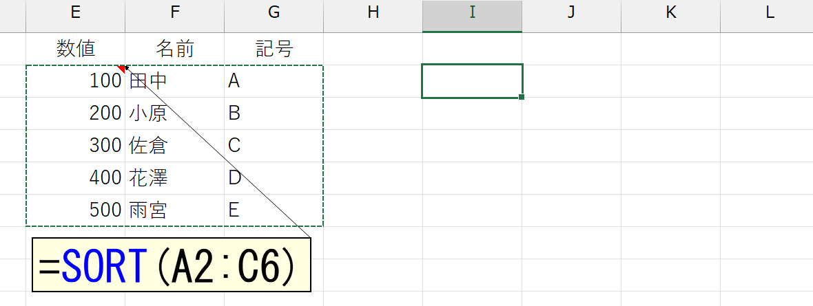 上図のセルE2にはSORT関数を入力しました。そのセルE2だけをコピーして、セルI2に値貼り付けします。結果は下図のようになります。
